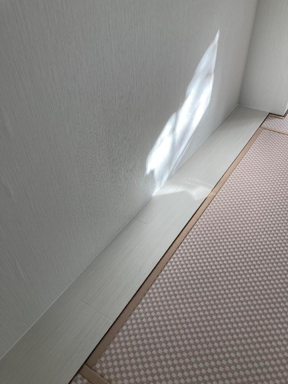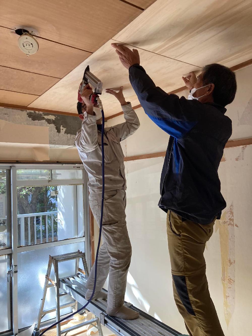 和室天井のラミ天にベニヤを貼りクロス仕様にし、汚れた板間はホワイト色のロイヤルウッドを貼りました(^^♪
