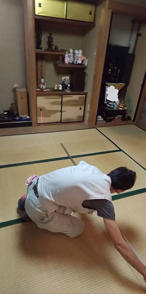 畳のご新調ですので、事前にレーザー測定器でお部屋の寸法を採寸します!