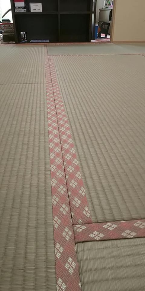畳縁は緑色の亀甲からアーガイル柄のピンク色の畳縁へ。