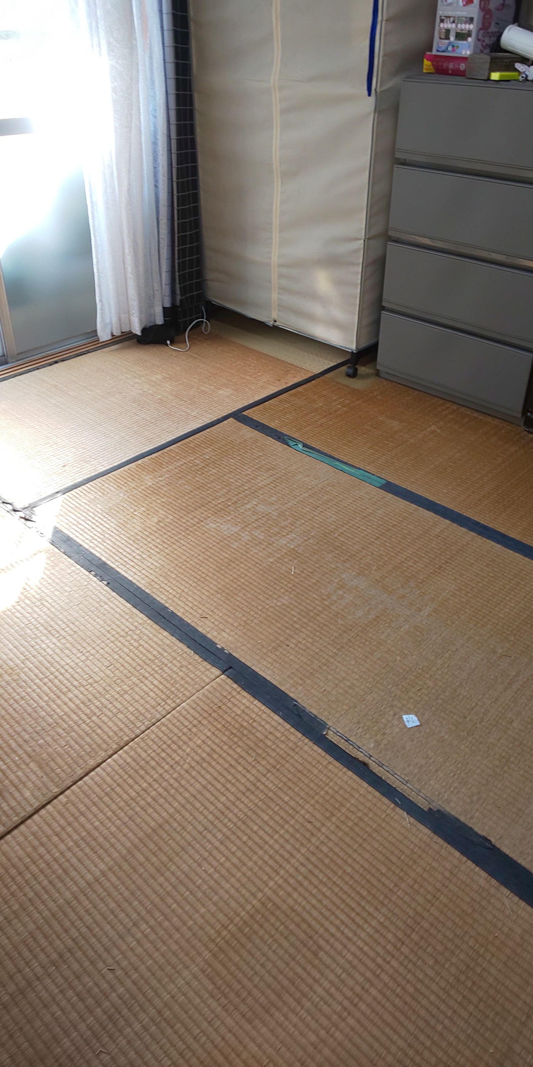 大阪市都島区にお住まいのH様宅の和室6畳の畳ご新調させていただきました(^^♪ 40年ほど畳替えをされていないということでご新調のご依頼です。 い草ではないカラー畳にしたいということでSEKISUI MIGUSA「美草」の中からお選びいただくことに・・・ MIGUSA「美草」は、樹脂に無機材料を配合した畳表なので、色あせしにくいので耐久性がとても優れています! 今回は、畳のご新調ですので、事前にレーザー測定器でお部屋の寸法を採寸します。 畳は1枚1枚サイズが違います! 敷居や壁もほぼ真っ直ぐにできていることはありません・・ 細かく採寸していきます(^^)/ そして悩みに悩み抜いて、ご選択されたのは 畳表:SEKISUI MIGUSA 市松グリーン 畳縁:ストリームNo.1 清流01 濃淡の市松模様が小粋でオシャレ感をもたらしてくれます(^^♪ サイズも隙間なくピッタリ納まりました( ^^) _U~~