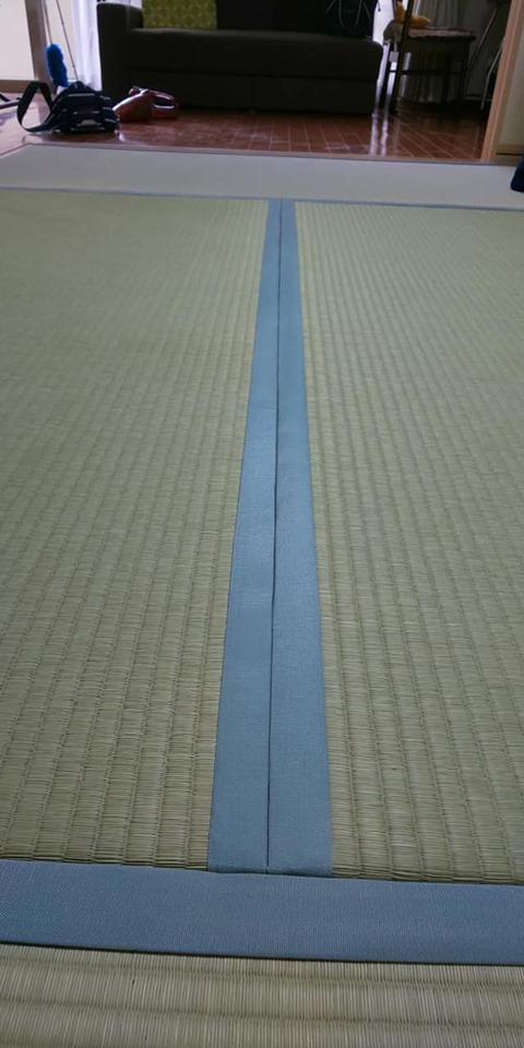 大阪市都島区にお住まいのY様の和室6畳の畳表替えさせていただきました☆ ポスティングチラシご覧になられてのご依頼です! ありがとうございます(^^♪ 初めての畳替えです! 現状は糸引畳表でした・・・ 国産の良い畳表でのご希望でしたので、当店オススメの径糸が綿麻タブルの畳表をご採用です(^^)/ 畳表:熊本県ひのさやか 畳縁:菊水モナミNO.107 畳縁はシンプルに水色に! キレイになりました(*^^)v