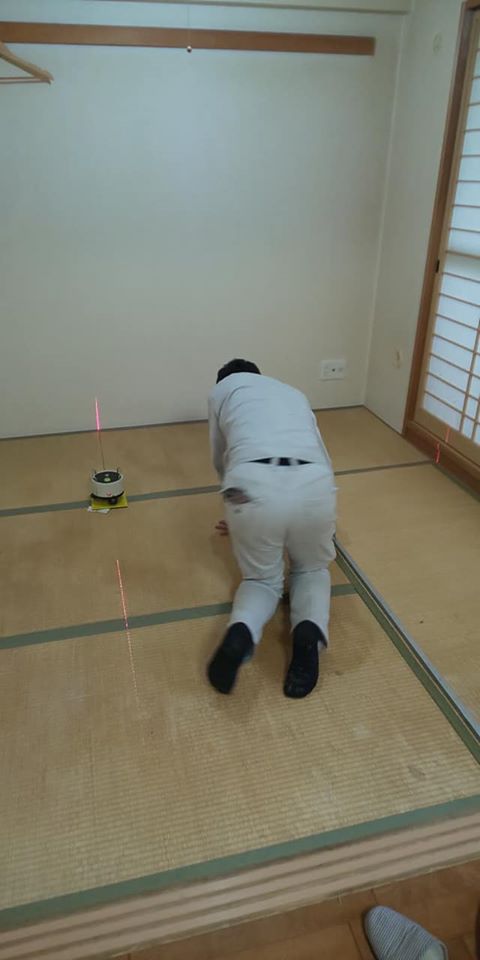 奥様が将来的に茶室として使われるかもしれないということで通常の和室4.5畳の敷き方ではなく、1間半の正方形のお部屋で真ん中に半畳が入る「右巴敷き」にて敷きました( ^)o(^ )