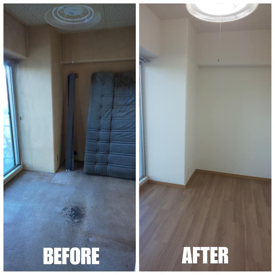 天井・壁クロス張替、床は現状のカーペットをめくって東リの板目調ロイヤルウッドを貼って仕上げました(^^)/