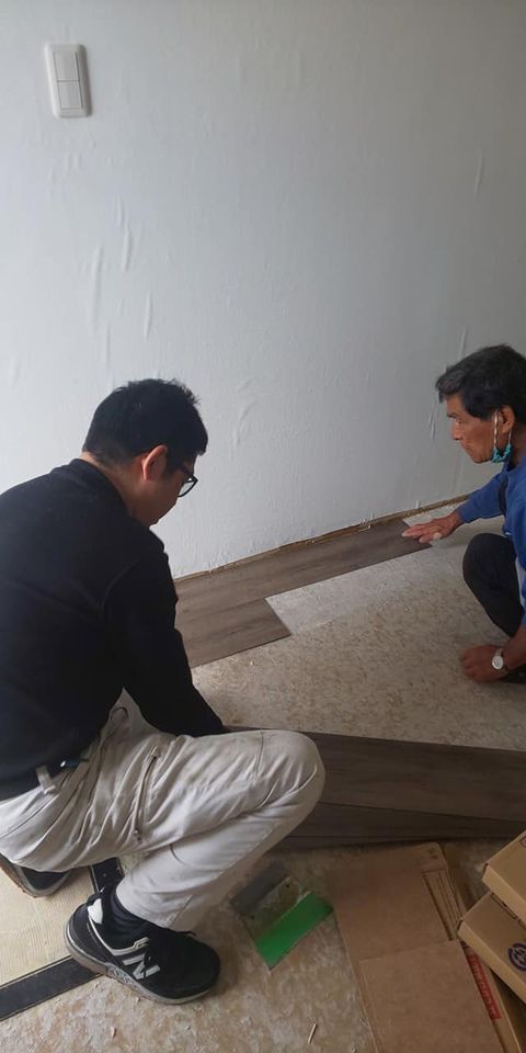 床は現状のクッションフロアをめくって東リのロイヤルウッド(ラフソーンパイン柄)を貼りました!