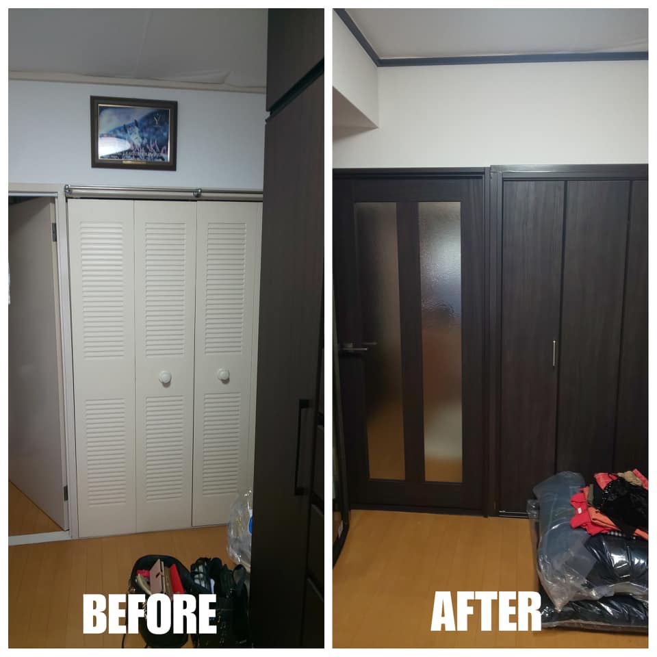 現状ある家具などが全ての黒、ダーク基調なので押入、ドア、引戸、収納扉を全てダーク色に統一しました(^_-)-☆