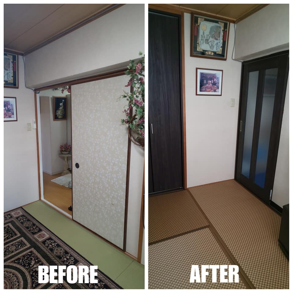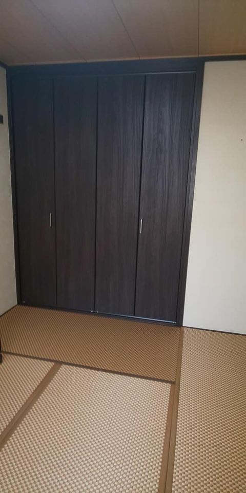 大阪市都島区にお住まいのK様宅の改装工事させていただきました(^^)/ 以前に畳替えしていただいたお客様からのリピートのご依頼でした(*^^*) 今回はお部屋全ての建具(ドア、引戸、収納扉)の交換、脱衣洗面室・トイレのクロス・クッションフロア張替、トイレ交換、お風呂ドア交換、和室の畳表替、障子新調、ペンキ工事させていただきました(^^)/ 黒、ダーク系基調が非常に大好きなお客様。 現状ある家具などが全ての黒、ダーク基調なので押入、ドア、引戸、収納扉を全てダーク色に統一しました(^_-)-☆ それに伴い廻り縁、巾木などをダーク色のペンキを塗り色を合わせました( ^)o(^ ) 奥様が非常に不便に思われていたお風呂の入り口のドアを折戸に交換(*^^*) トイレのクロスは壁1面を黒基調のクロスでアクセントを! そして、和室の畳は表替え。 前回は他の和室の畳は市松ブラック色に表替えさせていただきましたが、今回は・・ 畳表:SEKISUI MIGUSA 市松 ダークブラウン 畳縁:虞美人草04 ダークブラウン 建具の色ともバッチリでした! 奥様のご希望が全て叶ったリフォームで大変喜んでいただけました☆ 新鮮な気分でお正月を迎えることができますね( ^)o(^ ) ご依頼ありがとうございました(^^♪
