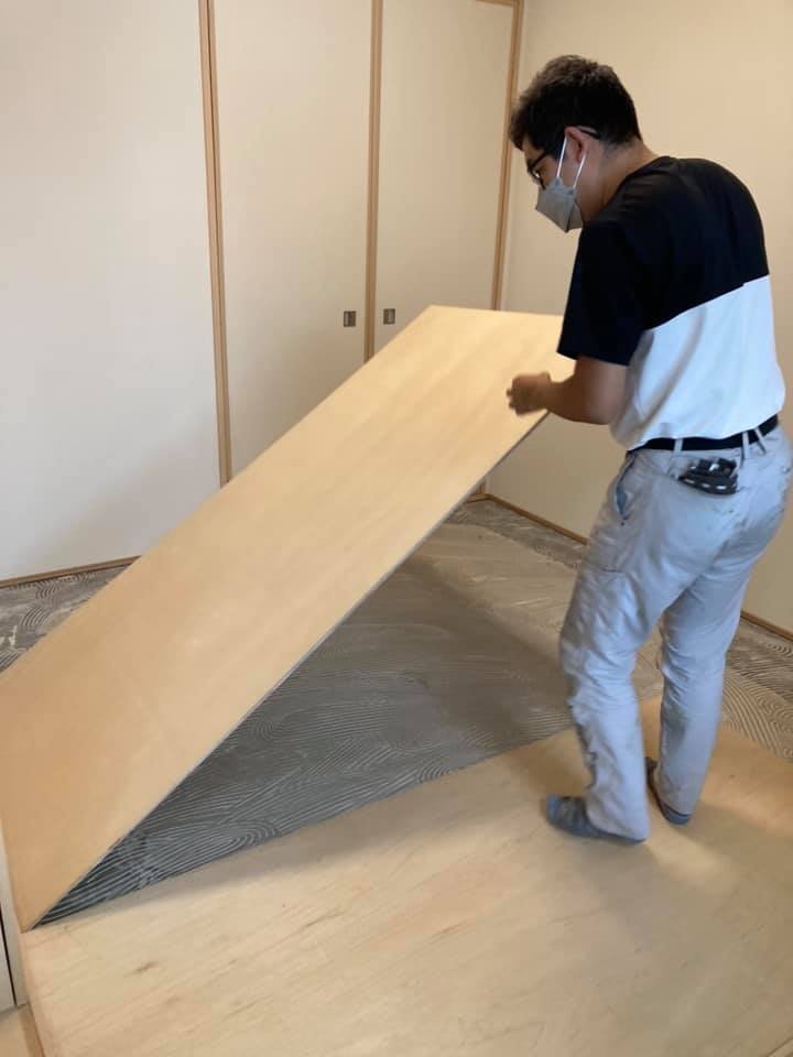 薄い畳だったので畳の厚み分は構造用合板を敷いて床上げして、ホワイト色のフローリングを貼りました(^^)/