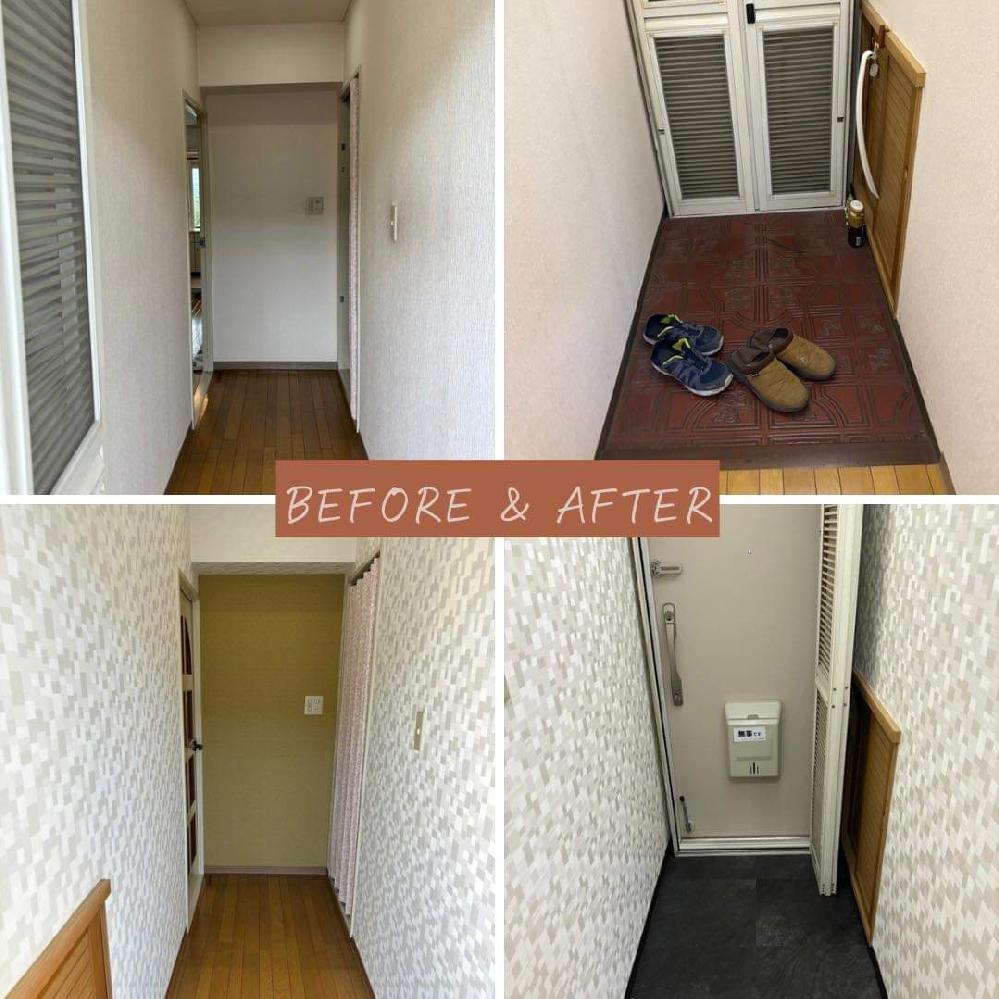 こんにちは😊たつみ商店です! 大阪府守口市にお住まいのK様宅の玄関ホールのクロス張替させていただきました✨ 玄関真正面の壁一面をアクセントクロスにしました😊 そして、玄関の床もブラックのタイル調のロイヤルストーンを貼り、雰囲気が一気に変わりました😎