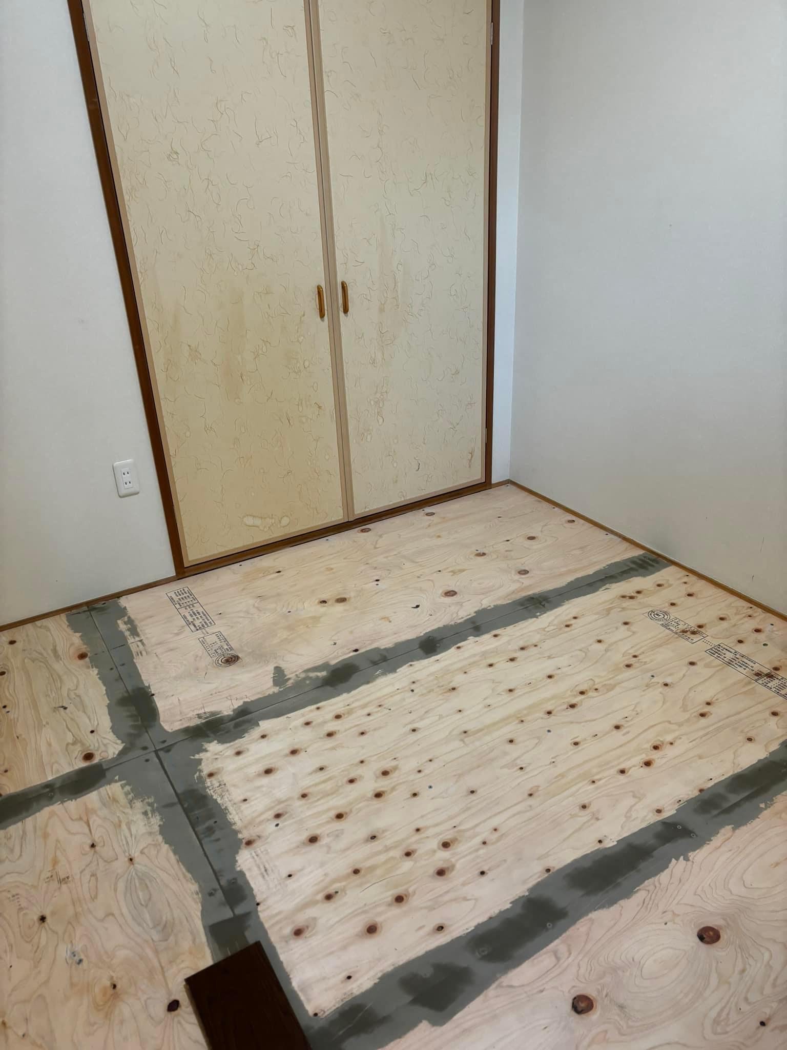 畳の厚み分を12mmのコンパネで床上げし、L45対応のEIDAI スキスムSダイレクト45(ショコラブラウン色)を敷きました😊