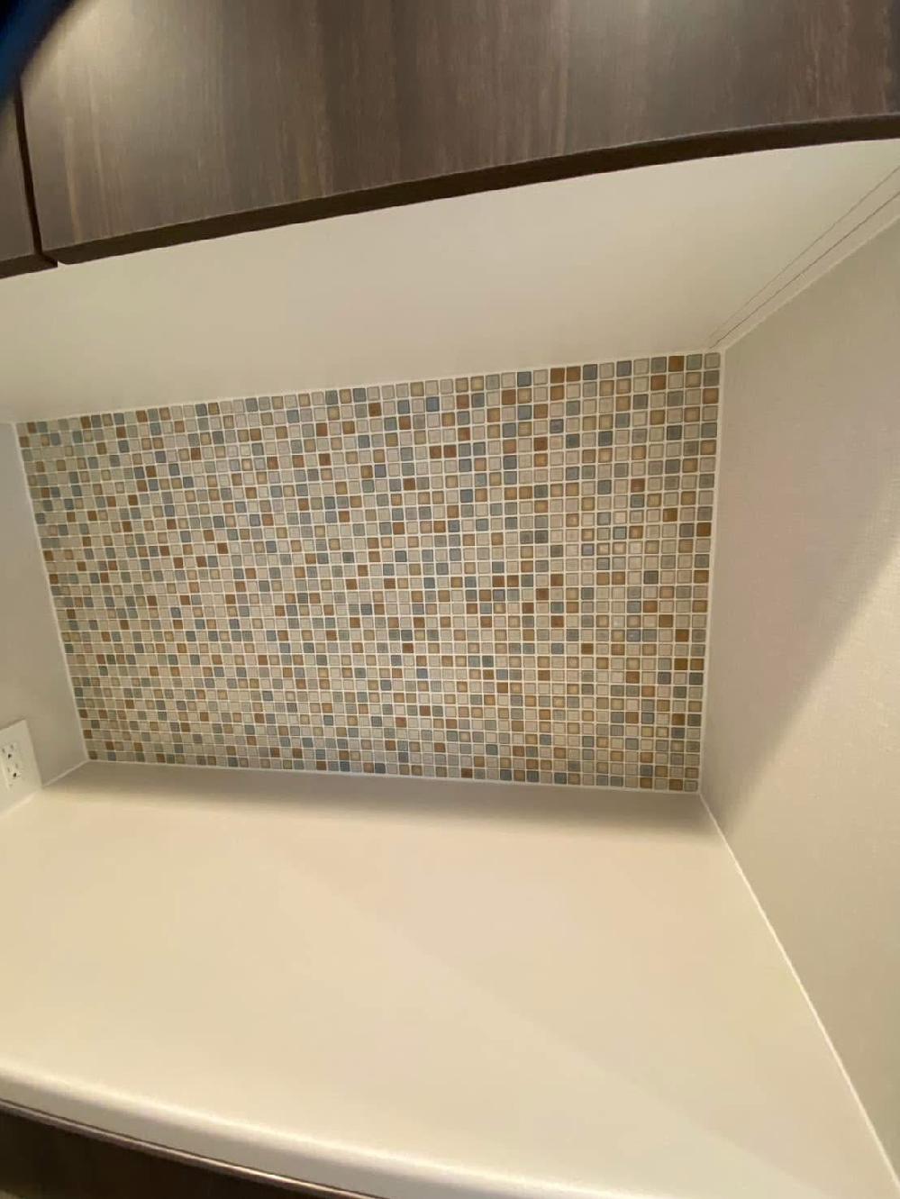 さらに、こだわりのアクセントとして、吊戸と下台の間には LIXILインテリアモザイク「カレイドグレイス」 を施工!