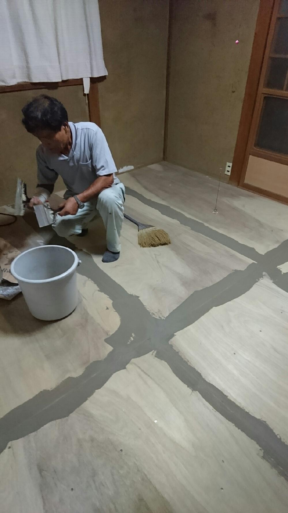 畳を撤去し、根太を約30p間隔に並べ、高さを調整した後ベニヤ下地を張ります。