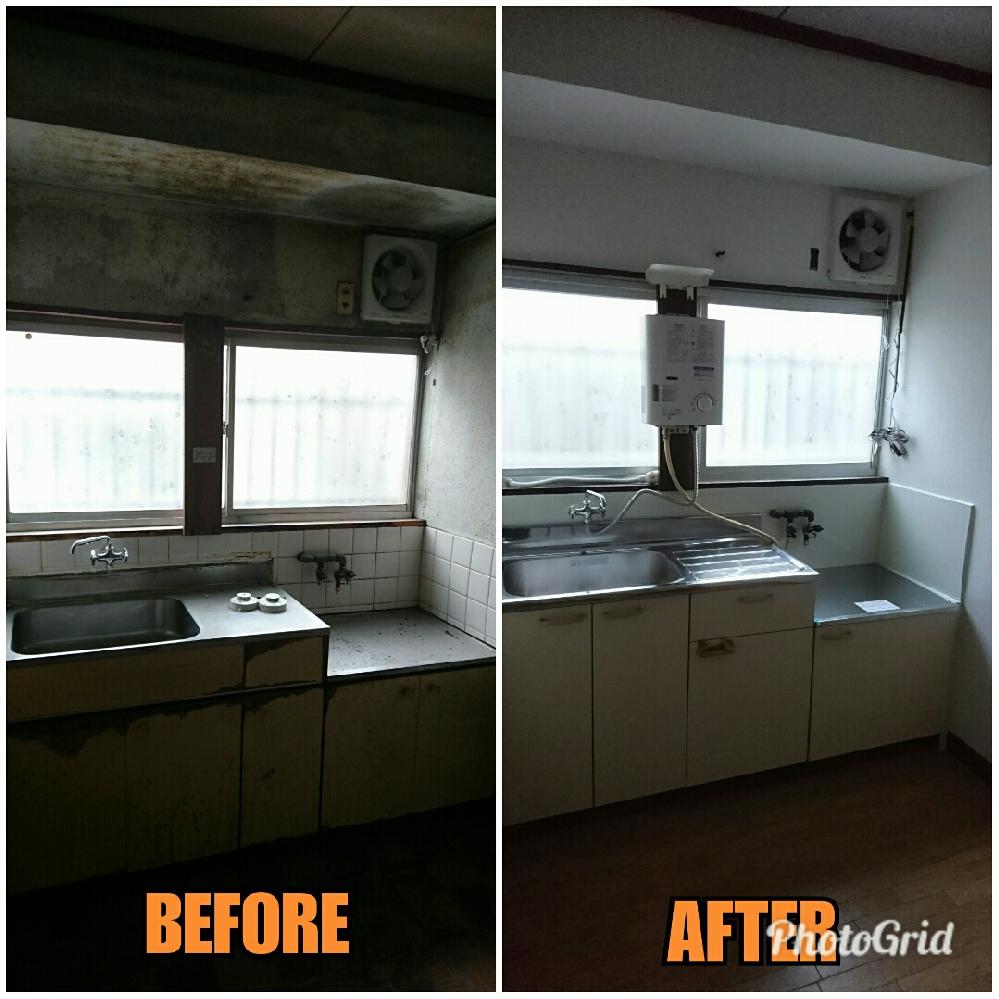 大阪市旭区の戸建て賃貸の内装リフォームさせていただきました。 築年数も古く、壁・天井・床の下地の状態も悪かったので、ベニヤ板を貼り、パテ処理をしてからクロス・クッションフロアを張りました! クロスは無地系でしたが壁の汚れなどで薄暗い雰囲気のお部屋が見違えるほど明るくなりました(^^)/ 流し台も新しくなって気持ち良いです(^◇^) 畳は新たに新調させていただきました。