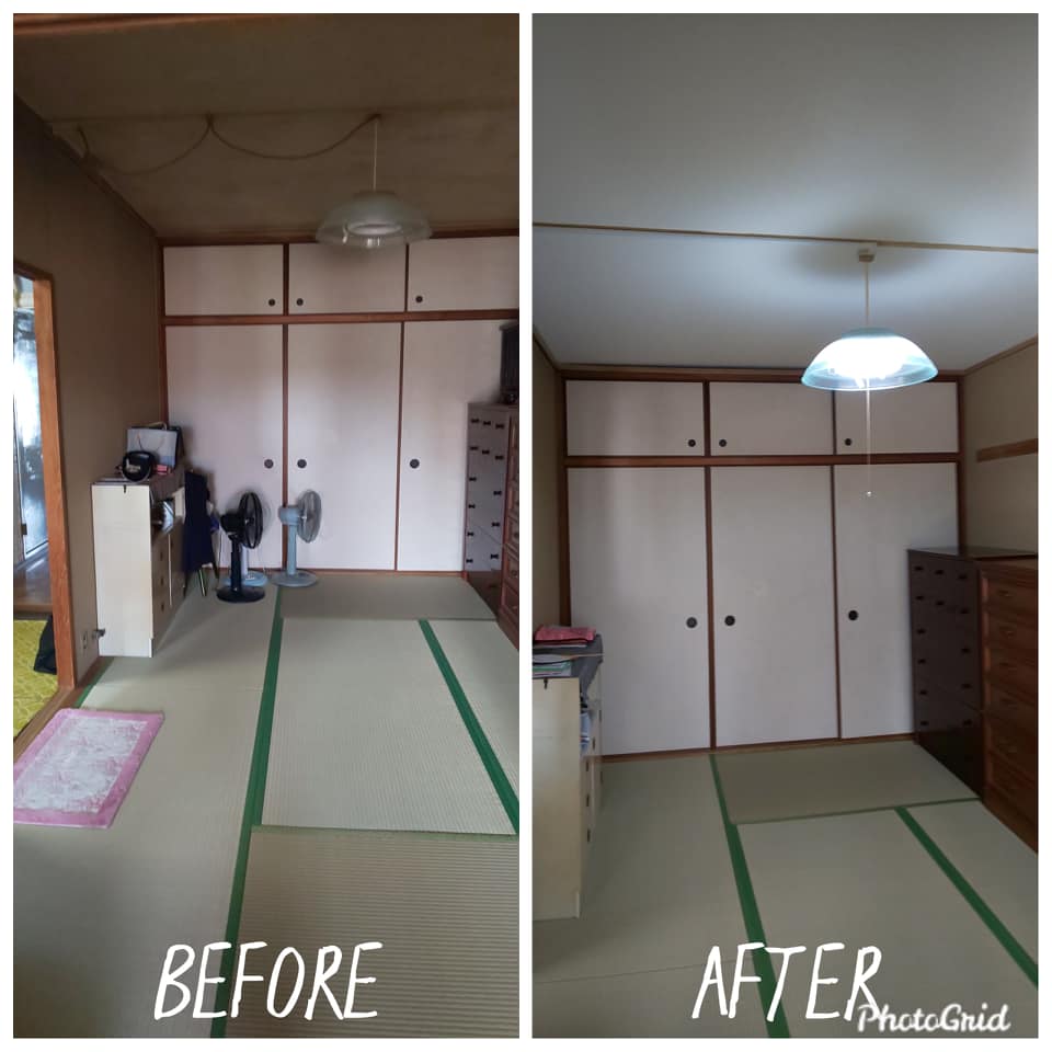守口市にお住まいのS様宅の改装工事させていただきました(^^♪ 昨年の年末に畳替えしていただいたお客様からのご依頼でした! ホール・LDK・洋室の天井・壁クロス貼替、和室の天井貼替、ホール・LDKのクッションフロア貼替です。 クロスはたばこのヤニで茶色の汚れが目立ち、めくれている箇所が目立ち・・ 下地の状態がとても悪かったので目立たないように厚めの無地のクロスに☆ そして、LDKの床は見切り材を挟みカーペットとクッションフロアでしたが、見切り材を取っ払ってフローリング調のクッションフロアに☆ 床の下地も凸凹でしたのでできる限りパテをしてからクッションフロア貼りました! お部屋が見違えるように明るくなりました☆