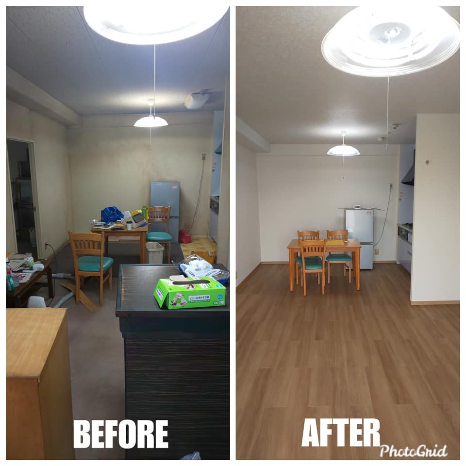 現状、床がカーペットだったLDKも段差を無くすため12mmのコンパネを貼り、木目調プリントタイルのロイヤルウッド貼りました(*^^)v
